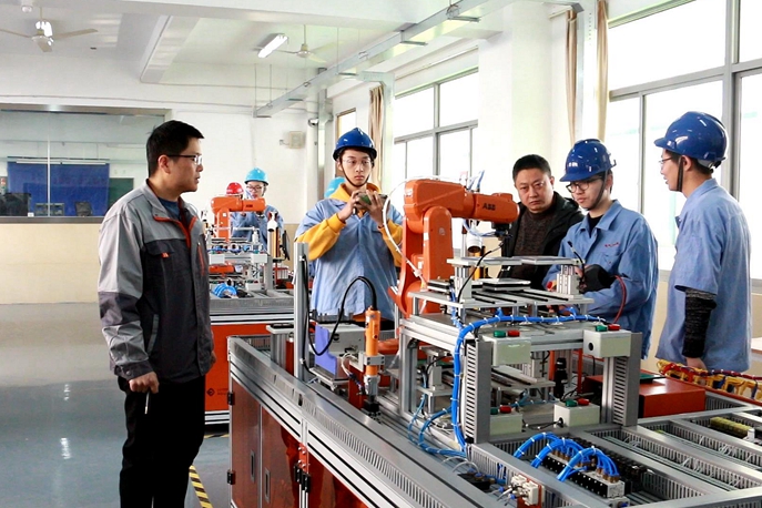 为促进常熟市职业学校教师交流,落实书证融通,做实“1+X”证书试点工作,提升教师教学能力和水平,发挥中心组示范引领作用。1月13日,以“1+X工业机器人操作与运维等级考核经验交流”为主题的常熟职业教育加工制造类专业(电)中心组研讨活动在我校顺利举行。常熟市职业教育加工制造类专业(电)中心组成员及各学校选派的骨干教师参加了本次活动。活动议题包括四项内容:示范课展示及评课;1+X工业机器人操作与运维等级考核经验分享;考核评价组织——华航唯实介绍考核要求标准;协作组交流讨论各个学校1+X考证推进情况。