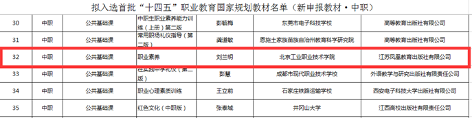 为不断加强职业院校教材建设,教育部职业教育与成人教育司印发了《关于组织开展“十四五”首批职业教育国家规划教材遴选工作的通知》等文件,经单位申报、形式审查、专项审核、网络和会议评审、专家复核等程序,共有7262种教材拟入选首批“十四五”职业教育国家规划教材。江苏省常熟职业教育中心校副校长张恒、陆琴老师参与的由北京工业职业技术学院刘兰明教授主编的《职业素养》入选首批“十四五”职业教育国家规划教材。