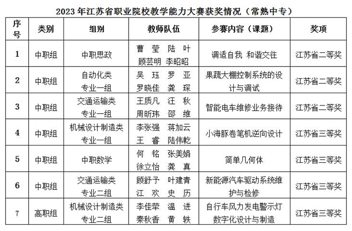 近日,由江苏省教育厅、总工会、团省委、省妇联四部门联合举办的2023年江苏省职业院校教学能力大赛比赛成绩揭晓,常熟中专校在比赛中发挥出色,,7支参赛队伍全部获奖,分获中职教师组获二等奖3项、三等奖3项,高职教师组获三等奖1项。