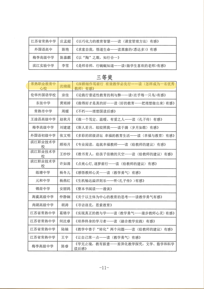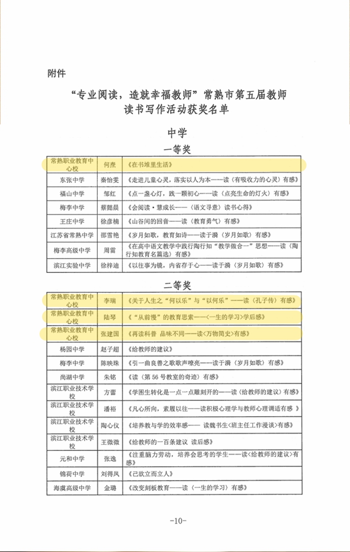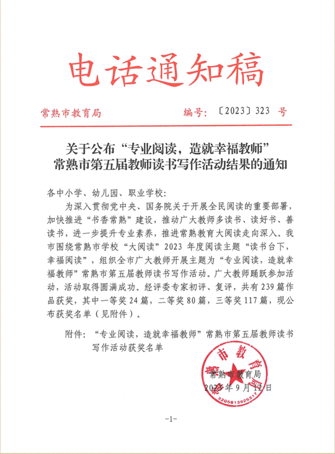 9月12日,由常熟教育局主办的常熟市第五届教师读书写作活动评审结果公布,我校何焘老师获一等奖,李瑞、陆琴、张建国三位老师获二等奖,沈晓霞老师获三等奖。