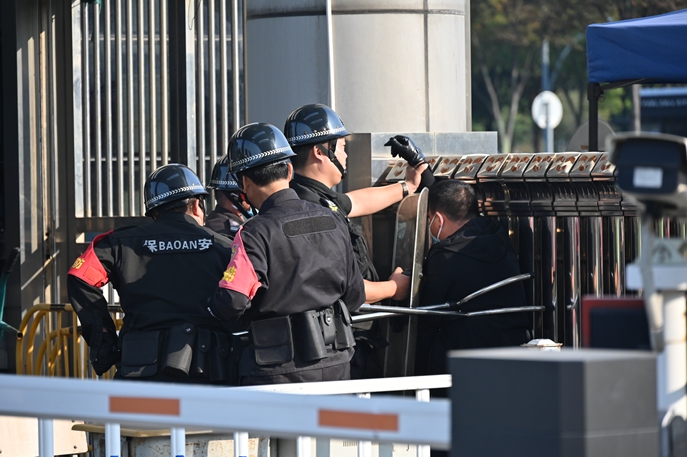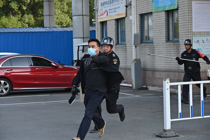 下午14:55演练开始,由一名保安扮演的校外“歹徒”冒充学生家长进入学校后,随即从腰间拔出利器对路过学生准备行凶。门口保安人员及时发现,大声通知门卫值班室内的保安,并第一时间按下值班室的一键报警装置,同时迅速组织人员分别手持钢叉、护盾等追上歹徒,将其合围。在歹徒″企图使用利器进行反击时,大家协同合作,经过一番搏斗,终于将歹徒制服。