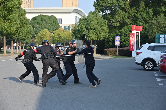 演练结束后,演练总指挥杨志良副校长现场进行点评。首先,他充分肯定全体演练人员的良好表现和校安保处的精心准备。同时指出:校园内处置暴力恐怖事件一定要以维护师生员工的生命安全为中心;以避免伤害、平息事态、控制局面、防止扩散为目标;无论何时何处一旦出现暴力袭击事件,获得事件信息的任何人都应当在第一时间按下一键报警装置,同时迅速组织安保力量,携带防卫器械,与犯罪分子周旋,不能迅速制服的情况下要尽最大力量防止犯罪行为的蔓延,为警方出警赢得时间。最后,他提了三点要求:一是要求各部门认真学习我校制定的“校园反恐应急预案”,熟悉具体事件的处理办法;师生平时一定要有应急避险的意识和能力。二是安保处一定要带领保安严格门卫登记、管理制度,控制外来人员进入学校。三是要切实提高保安人员处理暴力突发事件的应急能力及使用安保器材能力、增强学校保安人员面对突发事件时的心理素质等,筑牢校园安全屏障。