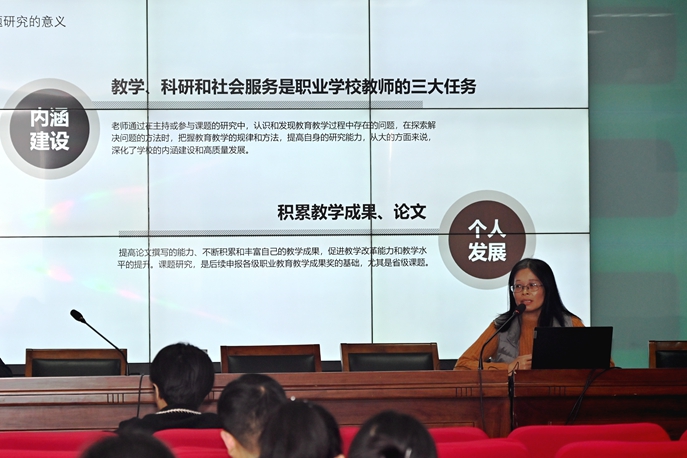 随后,科研科技处处长陆丽丹以《职业教育教学改革课题选题方向解读》为题,提出研究课题既要注重理论性,又要强调实践性,她以近年的多个实例为方向,建议大家围绕教学改革、产教融合、课程思政等工作中的重点、难点、热点问题选题。