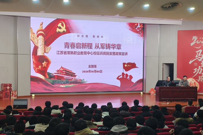 为深入开展国防教育,引导学生全面了解国家征兵政策与优抚待遇,1月5日下午,我校在报告厅举行2026年度学生入伍与退役政策专题宣讲会。会议特邀常熟市退役军人事务局四级调研员金国强担任主讲,各系部近600名适龄学生到场参加。会议由学校副校长金华主持