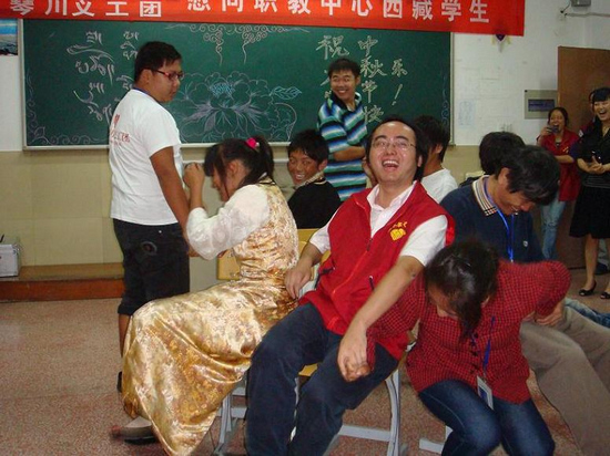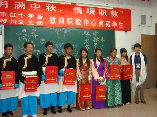 中秋节晚上,市红十字会张会长及流水琴川义工团吴老师一行10多人来到西藏班教室,大家兴高采烈,载歌载舞共度良宵。活动中,西藏生还接受了月饼等礼物。中秋前,西藏学生与09风景与导游专业学生也进行了联欢,大家品尝了烹饪班同学和西藏同学一起制作的鲜肉月饼,两个班在深厚的汉藏情谊中结为姐妹班。
