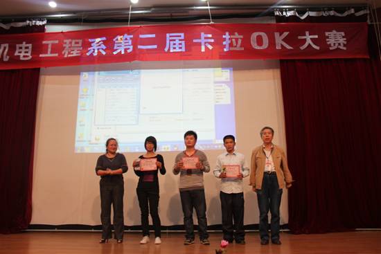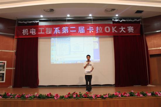 天气入秋,凉意渐起,机电系第二届卡拉OK大赛于10月13日下午热烈举行,14名选手的精彩演唱多次博得了同学们的鼓掌欢呼。09高技数控班的陈涛、08高技数控2班的俆裕、10高技汽修班的陶月分获一、二、三名,机电系邢月琴副主任、学生科徐元辉科长为获奖同学颁发了证书和奖品。