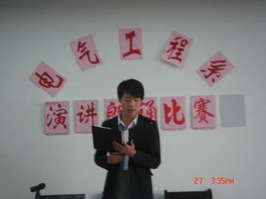 为弘扬积极向上的校园文化,丰富同学们的课余生活,电气工程系于10月底举行了以“扬职教精神,圆我成才之梦”为主题的演讲比赛。比赛过程中,选手们积极准备,热情参与,个个精神饱满,慷慨激昂,用激扬的文字,恢弘的气势,动情的声音抒发了自己无悔的青春和昂扬的斗志。最终,08中技电子电工王丽萍获冠军。