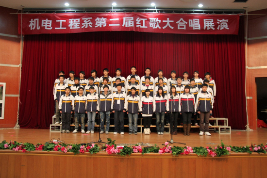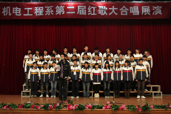 12月15日下午,机电工程系隆重举行了第二届红歌大合唱比赛,经过近一个多月的精心准备和认真排练,16个班级参加了这场比赛。比赛中,同学们满怀激情,引吭高歌,用歌曲表达对祖国深深的情、浓浓的爱。《爱我中华》、《打靶归来》、《铁道游击队之歌》等一首首大家熟悉的红色歌曲响彻校园。(机电系)