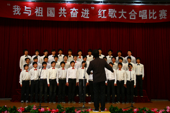 来自全校各系部的10个合唱队参加了比赛。比赛在电气系《大中国》荡气回肠的歌声中拉开了帷幕。随后,各参赛队以饱满的激情演唱了《保卫黄河》、《没有共产党就没有新中国》、《打靶归来》等一首首脍炙人口、催人奋进的爱国歌曲。整齐统一的服装、高亢嘹亮的歌声,把比赛的气氛不断推向高潮,充分展现了我校学生昂扬、向上、活泼的精神风貌。
