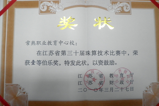 热烈祝贺我校经贸管理系在2010年江苏省第三十届珠算技术比赛中,被江苏省教育厅和江苏省财政厅授予壹等伯乐奖!