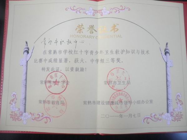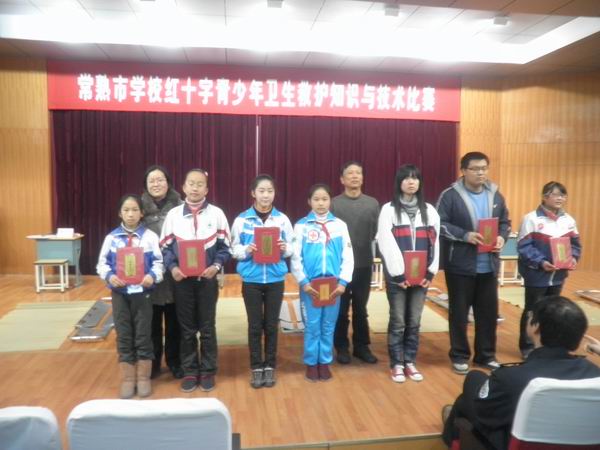 1月7日,经贸系09高职会计2班钱群芳等四名同学代表学校参加常熟市学校红十字青少年卫生救护知识与技术比赛。比赛共有11支队伍参赛,我校代表队获大、中学组第六名(三等奖)。