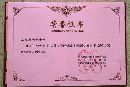 近日,我校荣获“碧水琴川”青少年廉政书签制作大赛优秀组织奖。2010年9月,大赛由常熟市纪委、宣传部、文广新局、教育局和市图书馆联合举办,旨在进一步弘扬具有常熟特色的“碧水琴川”廉政文化,推动廉政文化进家庭、进学校,增强青少年的廉洁诚信意识,培养正确的价值观和高尚的道德情操。我校传媒艺术系、电气工程系等系部积极组织发动,学生踊跃参与、认真制作,涌现了一批高质量的“碧水琴川”廉政书签作品,最终取得5个一等奖、8个二等奖、8个三等奖、6个优秀奖的优异成绩。