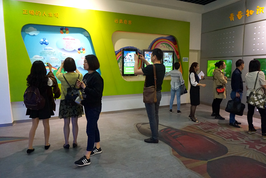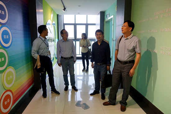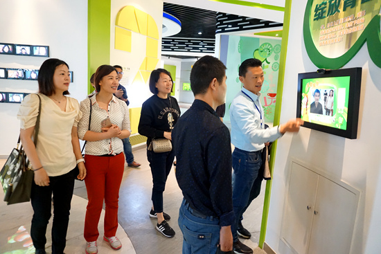 昆山一中专刘金桥副校长热情接待了我校考察团一行,在他的陪同下首先参观了心理健康教育基地。在王文名师工作室,合理的功能区划分、温馨的环境布置和校心理健康教育教师团队的简介,让我们分享到强大的工作团队辛勤付出所结出的丰硕成果。“青苹果之家”场地宽敞,硬件设施先进完备,分为个体咨询室、团体辅导室、情绪发泄室等,展示区设计了阳光乐章、绽放青春、认识青春、拥抱青春、飞扬青春、青春印记、青春期找茬、人体大冒险、青春知识大PK等板块,采用现代声光电技术、视频、动画、沙盘等手段营造出了一个个趣味生动、充满活力的心理健康教育空间,让学生在寓教于乐、轻松活泼的氛围中获取心理知识,认知自己,把握自我,从而帮助学生顺利走过人生花季,奔向美好未来。