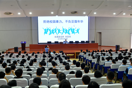 为进一步增强我校学生的法制观念,提高学生的自我保护和安全防范意识,教育学生成为学法、知法、懂法、守法、用法的文明中职生。5月4日上午,常熟市公安局东南派出所刘芸剑警官为我校600多位学生上了一堂主题为“拒绝校园暴力,不负豆蔻年华”的法制教育专题讲座。东南派出所殷建平教导、学校吴国清副校长出席法制讲座报告会,讲座由学生工作处钱立新处长主持。