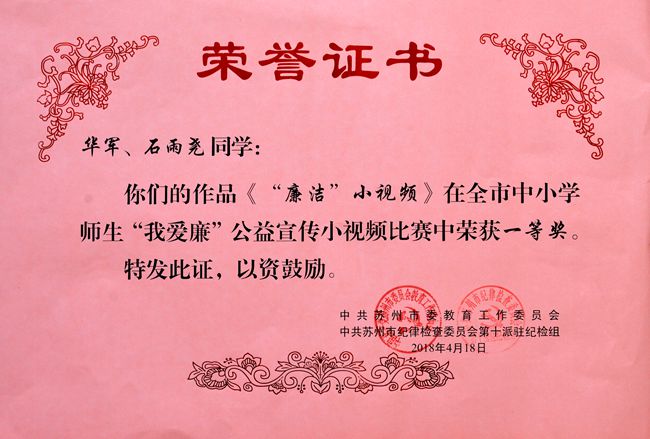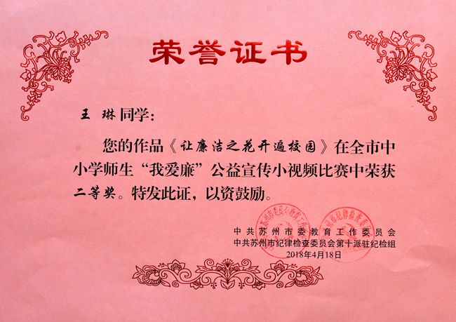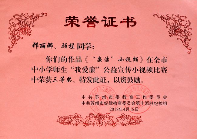 在扎实推进廉洁文化进校园活动中,学校党委充分发挥文化浸润和辐射引领作用,积极开展廉洁文化特色活动,营造浓郁的校园廉洁文化氛围。在苏州市委教育工委、苏州市纪委第十派驻纪检组组织开展的“廉石之光·清风校园”教育系统廉洁文化主题教育实践活动中,积极组织发动,指导学生制作“我爱廉”公益宣传小视频作品参加比赛。其中,传媒艺术系党支部选送的华军、石雨尧同学的作品获一等奖,邢丽娜、顾程同学的作品获三等奖,电气工程系党支部选送的王琳同学的作品获二等奖。