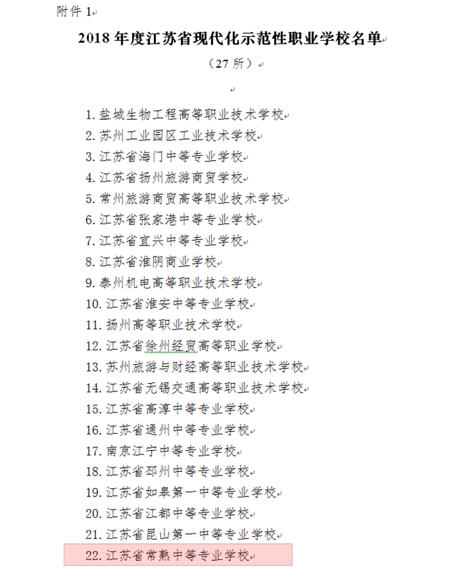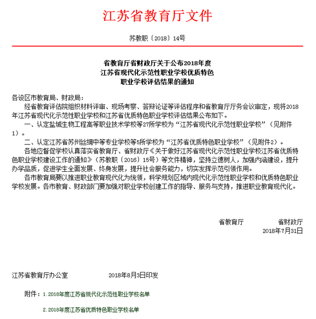 根据《省教育厅省财政厅关于公布2018年度江苏省现代化示范性职业学校优质特色职业学校评估结果的通知》(苏教职﹝2018﹞14号)文件精神,我校被认定为“江苏省现代化示范性职业学校”。