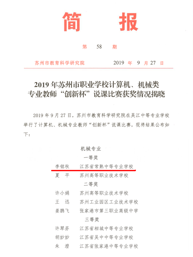 最终,李铭秋老师在9月26苏州市职业学校机械类专业教师“创新杯”说课比赛中荣获苏州市一等奖第一名的好成绩。