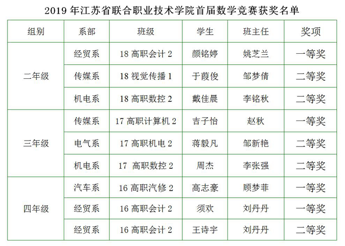 近日,江苏联合职业技术学院首届高职数学竞赛成绩揭晓。本次比赛共有来自66家分院和办学点共469名学生报名参赛,比赛分二年级、三年级、四年级三个组别。
