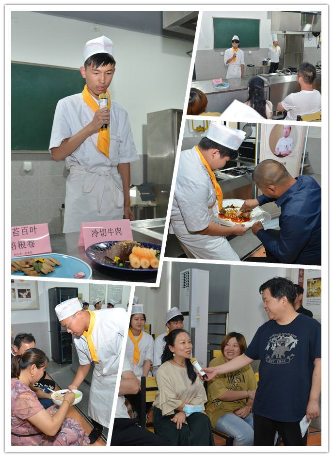 活动中,虞城饭店总厨曹晓峰师傅带领六位徒弟进行菜品制作。冷切牛肉、明珠鸡松碗、四味蒸蛋、鸿运波斯龙、海苔百叶培根卷、松鼠桂鱼一道道美味佳肴呈现在大家面前。随后,学徒们从操作原料、操作步骤、菜品呈现、操作心得等方面对观摩的同学和嘉宾进行了讲解。最后,曹师傅对学生们的菜品进行了点评。