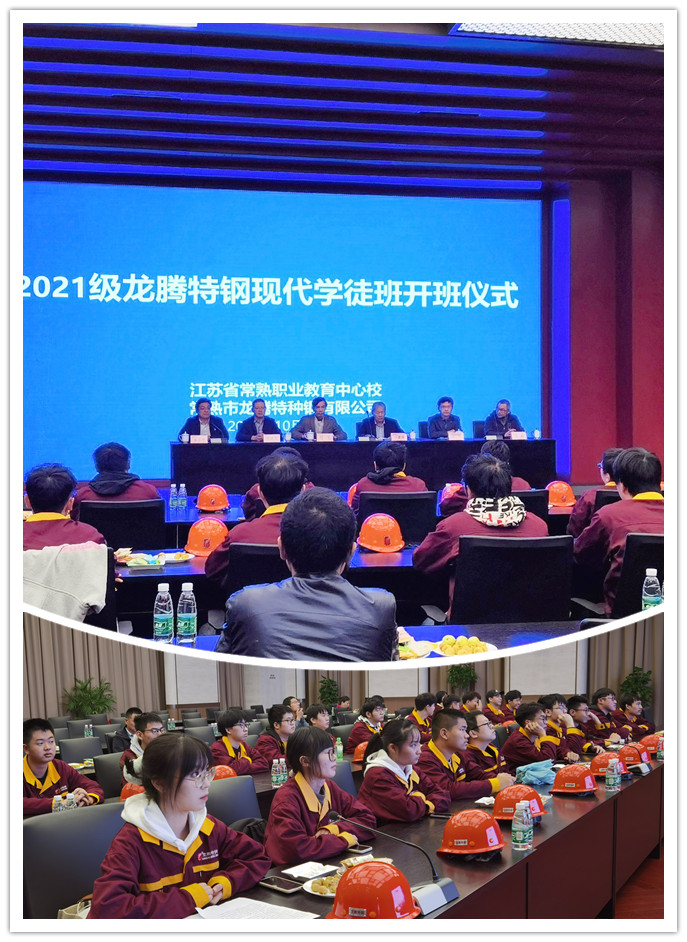 10月20日,2021级龙腾特钢先进制造现代学徒班开班仪式在常熟市龙腾特钢有限公司隆重举行。市教育局职社科科长陈飞、学校副校长金华、龙腾特钢副总经理丁君华、机电工程系主任陈洪飞、教师代表、龙腾特钢有限公司人事经理、部分分公司负责人、龙腾特钢全体学徒及家长出席开班仪式,会议由龙腾特钢党委办公室主任朱永坤主持。