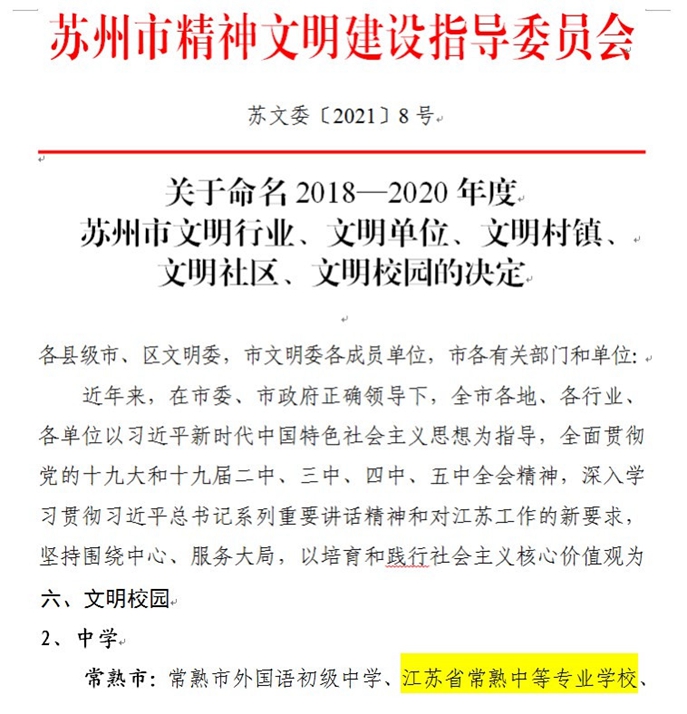 近日,苏州市精神文明建设指导委员会公布了《关于命名2018—2020年度苏州市文明行业、文明单位、文明村镇、文明社区、文明校园的决定》(苏文委〔2021〕8号),我校成功获评“苏州市文明校园”荣誉称号。