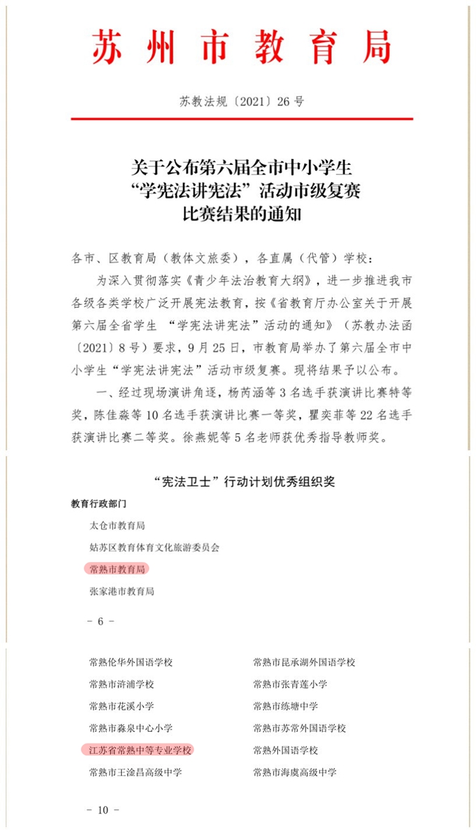 10月,我校组织全体19、20、21级共4605名学生参加“宪法卫士”行动计划——第六届全国学生“学宪法讲宪法”活动,参与率达100%,我校获苏州市优秀组织奖。各系部加强宪法法治宣传教育,不断提升广大学生宪法学习的主动性和积极性,推动形成学生比学赶超的良好氛围。