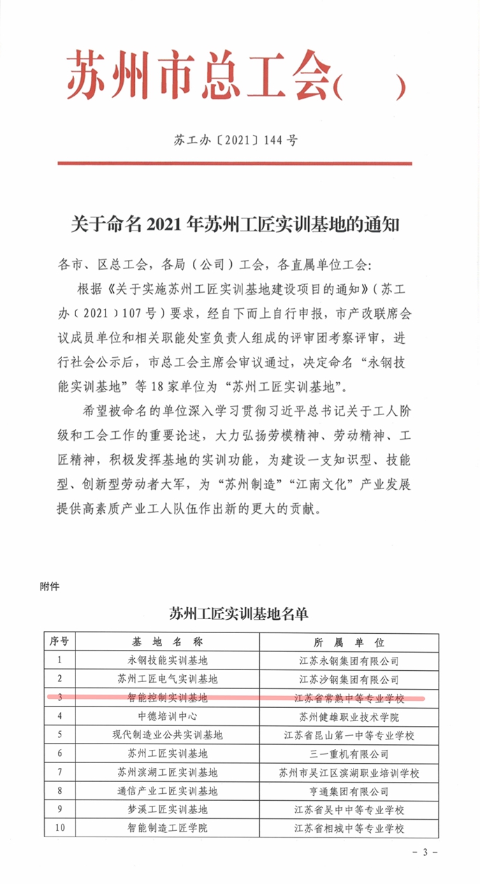 近日,从苏州市总工会获悉,学校智能控制实训基地被认定为“苏州工匠实训基地”。