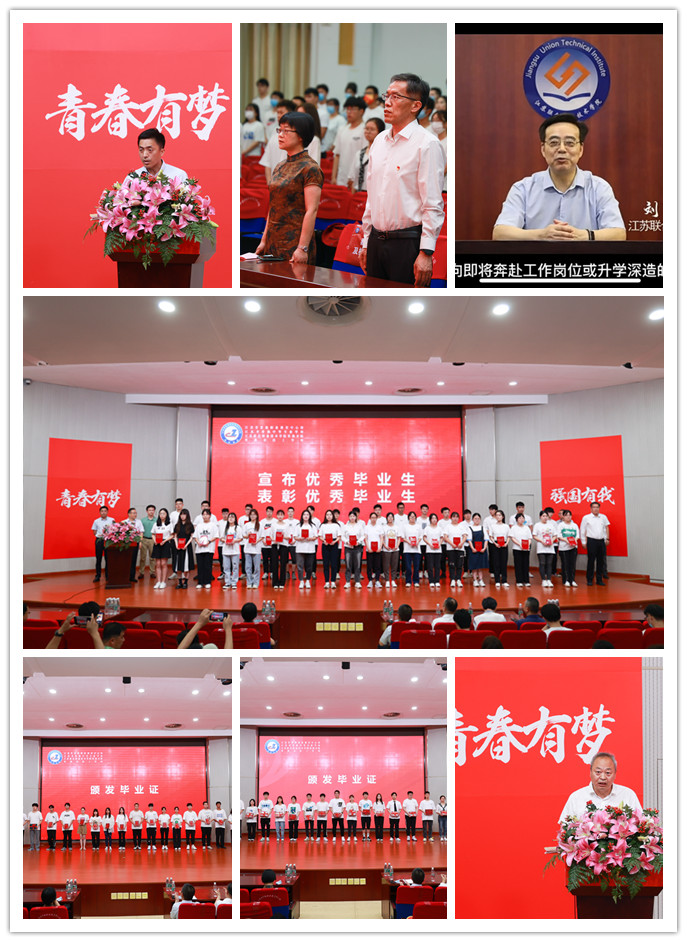 毕业典礼在雄壮激昂的国歌声中拉开帷幕,全场师生齐唱国歌,共同感受这一庄重时刻。同学们首先观看了毕业视频和江苏联合职业技术学院刘克勇院长的毕业寄语视频。张恒副校长宣读了《关于准予2022届屈佳晨等1242名学生毕业的决定》,何世伟副校长宣读了《关于表彰2022届优秀毕业生的决定》,校领导分别为毕业生代表颁发毕业证书、为优秀毕业生颁发荣誉证书。常熟市教育局副局长顾泳、常熟高新技术产业开发区组织人事劳动局局长俞敬和常熟经济技术开发区组织人事劳动局副局长郭浩分别上台致辞,希望毕业的同学们,珍惜岗位、珍惜青春,充分发挥职业优势,为建设“美丽常熟”贡献青春力量!两位开发区的领导还向毕业生们发出邀请,欢迎同学们到高新区、经开区建功立业。