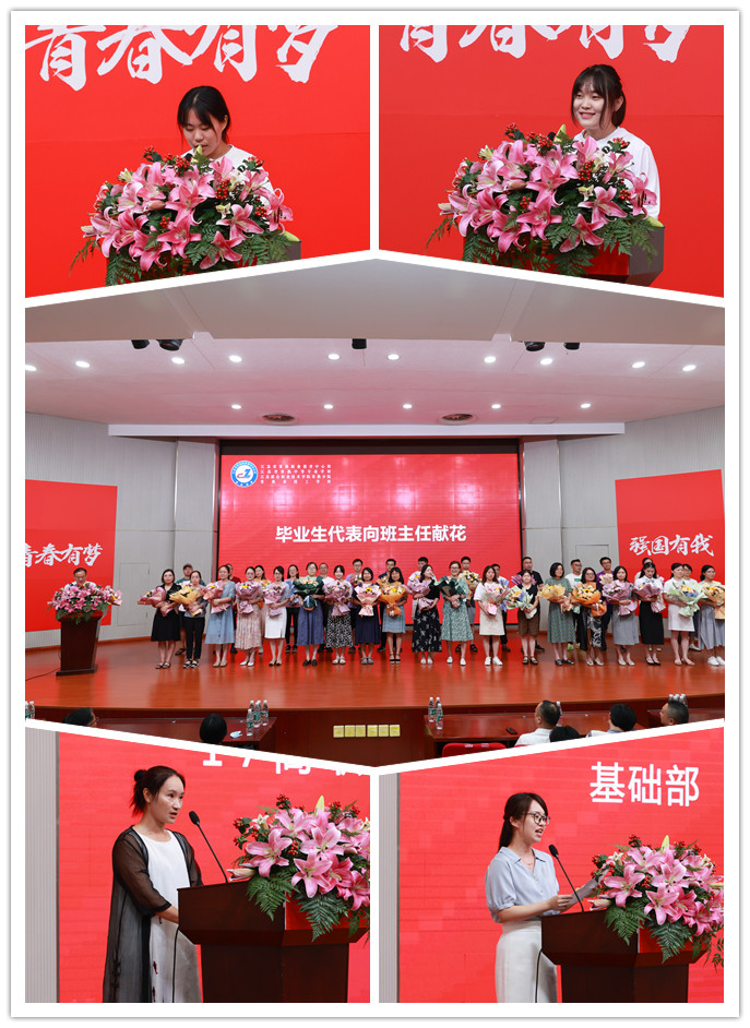毕业典礼上,基础部19单招3班沈祎雯同学和电气工程系17高职机电(2)班徐爽同学代表全体毕业生发言,分享了在学校的学习和生活,表达了对国家、学校、老师、父母的感恩之情。并承诺将秉持校训精神,肩负社会责任,恪守职业道德,勇挑重担、接续奋斗,不负韶华,不负时代。17高职视觉1班陈佳余同学家长阎超华女士作为全体毕业生家长代表发言,向为学生健康成长辛勤付出的全校教职员们表示感谢,对孩子们能够学有所成,顺利毕业表示衷心的祝贺。基础部陈晓老师代表全体毕业班班主任发言,她如数家珍的回顾了与同学们在学校学习和生活中的难忘瞬间,她希望同学们仰望星空,脚踏实地,成为一个集“温暖善良”、“诚实正直”、“宽容乐观”的人。发言完毕后,全体毕业生代表向班主任敬礼、献花,向守护学生成长的每一位“园丁”表达了尊敬与感恩。