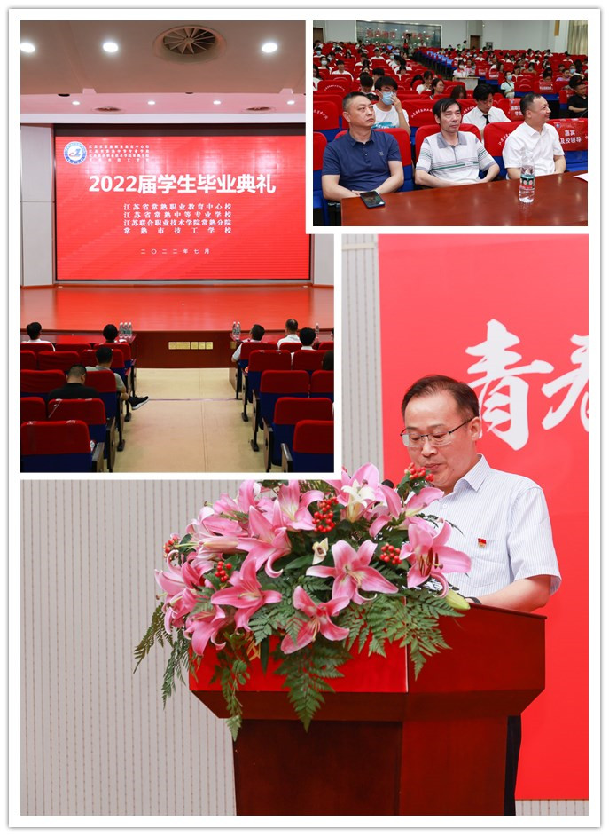 2022年7月7日下午,学校举行2022届学生毕业典礼。典礼设1个主会场、7个分会场。学校苏建青校长、吴国清副校长、何世伟副校长、张恒副校长、杨志良副校长、金华副校长、全体部门负责人、2022届毕业生、2022届毕业班班主任、2022届家长代表委员会代表参加了此次毕业典礼。此次毕业典礼还邀请到了常熟市教育局副局长顾泳、职社科科长陈飞、教研室副主任王春、高新技术产业开发区人劳局局长俞敬、经济技术开发区人劳局副局长郭浩出席。毕业典礼由吴国清副校长主持。