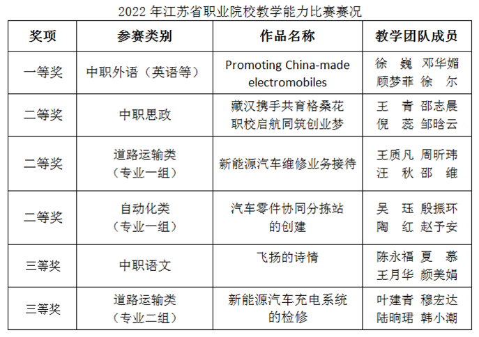 8月25日,由江苏省教育厅省、总工会、团省委、省妇联四部门联合举办的2022年江苏省职业院校教学大赛现场决赛落下帷幕。本次比赛采用初赛网评、线上决赛的形式进行,常熟中专校再创佳绩,6支教学团队获得一等奖1项、二等奖3项、三等奖2项的优异成绩。