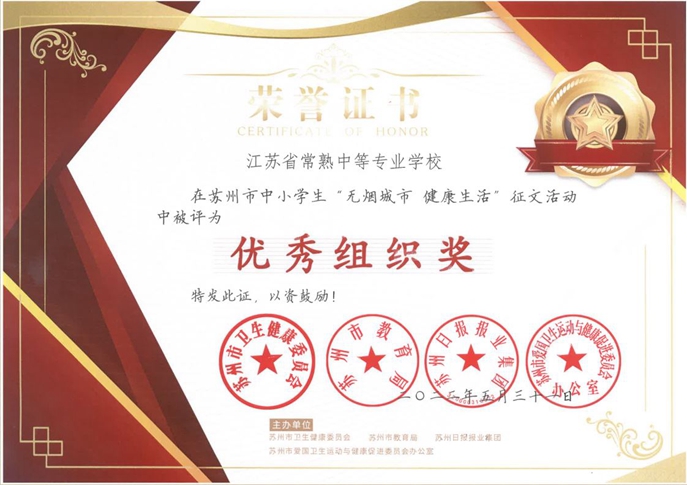我校广泛宣传、积极组织学生参加本次活动,同学们以“无烟城市健康生活”为主题,通过“家人戒烟故事、劝阻他人吸烟、捡拾烟头志愿服务等经历”作为选题方向,提交了较多高质量征文作品,通过各系部及学校层面筛选,共上报39件作品。在揭晓的结果中,我校被评为苏州市优秀组织奖。