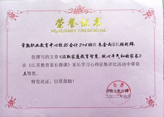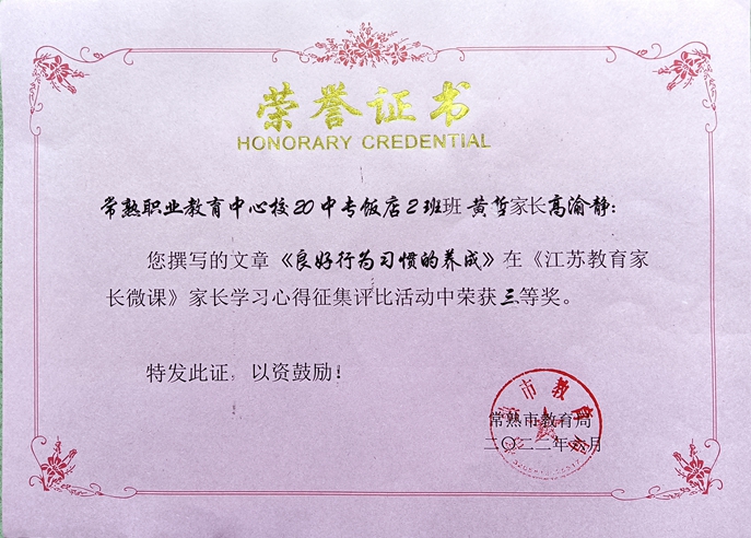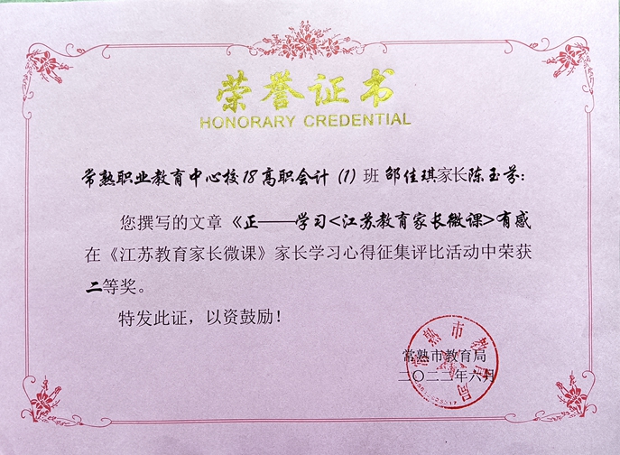 我校高度重视,充分利用线上家长课堂和线上家长活动,用好微课资源,提升家长家庭教育理念,并发动家长积极撰写心得体会。在《江苏教育家长微课》家长学习心得征集评比活动中,经评审,18高职会计(1)班邵佳琪家长陈玉芬撰写的文章《正——学习<江苏教育家长微课>有感》获二等奖,20中专饭店2班黄哲家长高渝静撰写的文章《良好行为习惯的养成》、20会计3+4班朱金雨家长顾利群撰写的文章《汲取家庭教育智慧,做心平气和的家长》获三等奖。