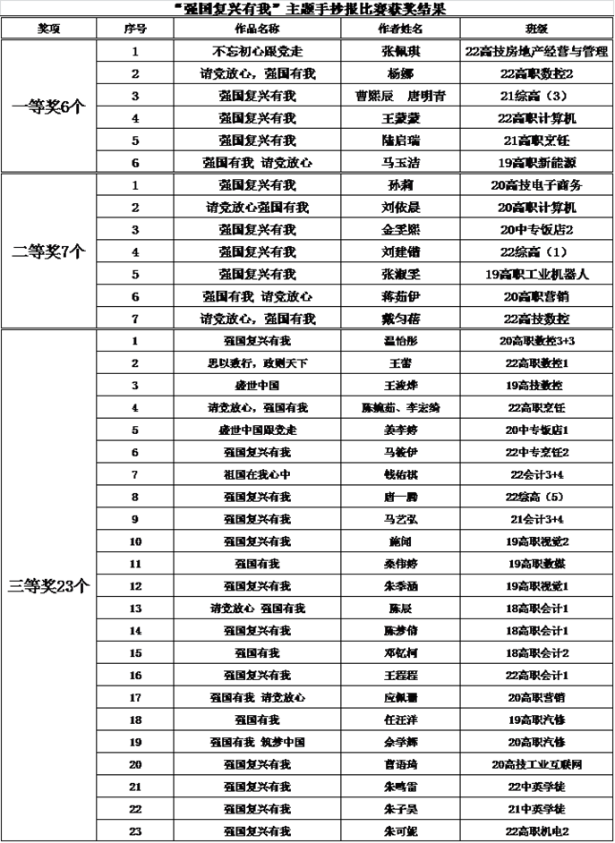 本次活动在学生工作处周密部署、各系部精心组织下,全校学生踊跃参与,同学们结合党史学习教育、“四史”宣传教育成果,用线条勾勒“中国心”、用色彩描绘“中国梦”、用文字书写家国情。经系部初选,上报到学校参评的手抄报作品整体质量较高(特别是经贸管理系),学校根据版面设计、内容选择、色彩搭配等因素,最终评选出一等奖作品6个、二等奖作品7个、三等奖作品23个。
