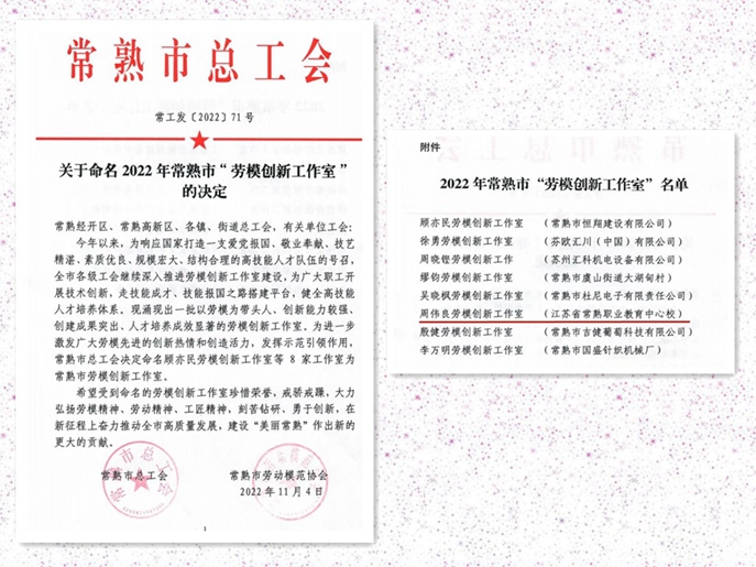 近日,常熟市总工会和常熟市劳动模范协会公布2022年“常熟市劳模创新工作室”名单,我校周伟良劳模创新工作室榜上有名,这是教育系统第一个被命名的常熟市“劳模创新工作室”。