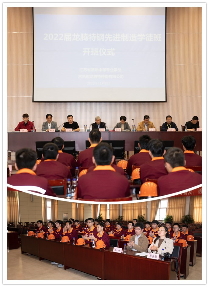 本着“同心勠力,共育匠才”的原则,深入落实新时代产业工人队伍建设改革方案,11月8日,第二届龙腾特钢先进制造现代学徒班开班仪式在常熟市龙腾特种钢有限公司顺利举行,学校校长徐丽娟、副校长王湖、机电工程系主任陈洪飞、副主任徐杰、教师代表、龙腾特钢副总经理丁君华、钢棒分公司总经理王士江以及2022级龙腾特钢先进制造学徒班全体学生共同出席开班仪式,开班仪式由常熟市龙腾特种钢经理钱可人主持。