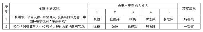 《三化引领、平台支撑、融合育人-发展共同体愿意下中国特色学徒制“常熟实践”》、《校企协同精准育人- 6C教学治理体系的构建与实践》这二个获奖项目是我校在人才培养和相关专业教育教学工作中经过多年探索、研究和实践所获得的成果,集中体现了我校近年来在教育教学改革方面的特色与成效。