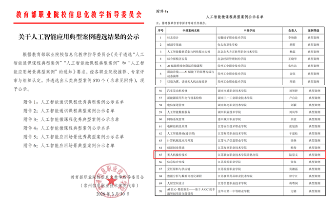 3月30日,教育部职业院校信息化教学指导委员会公布《关于人工智能应用典型案例遴选结果的公示》。我校陆崇义老师负责的《无人机操控技术》微课程项目经过层层筛选,成功入选“人工智能微课程典型案例”。